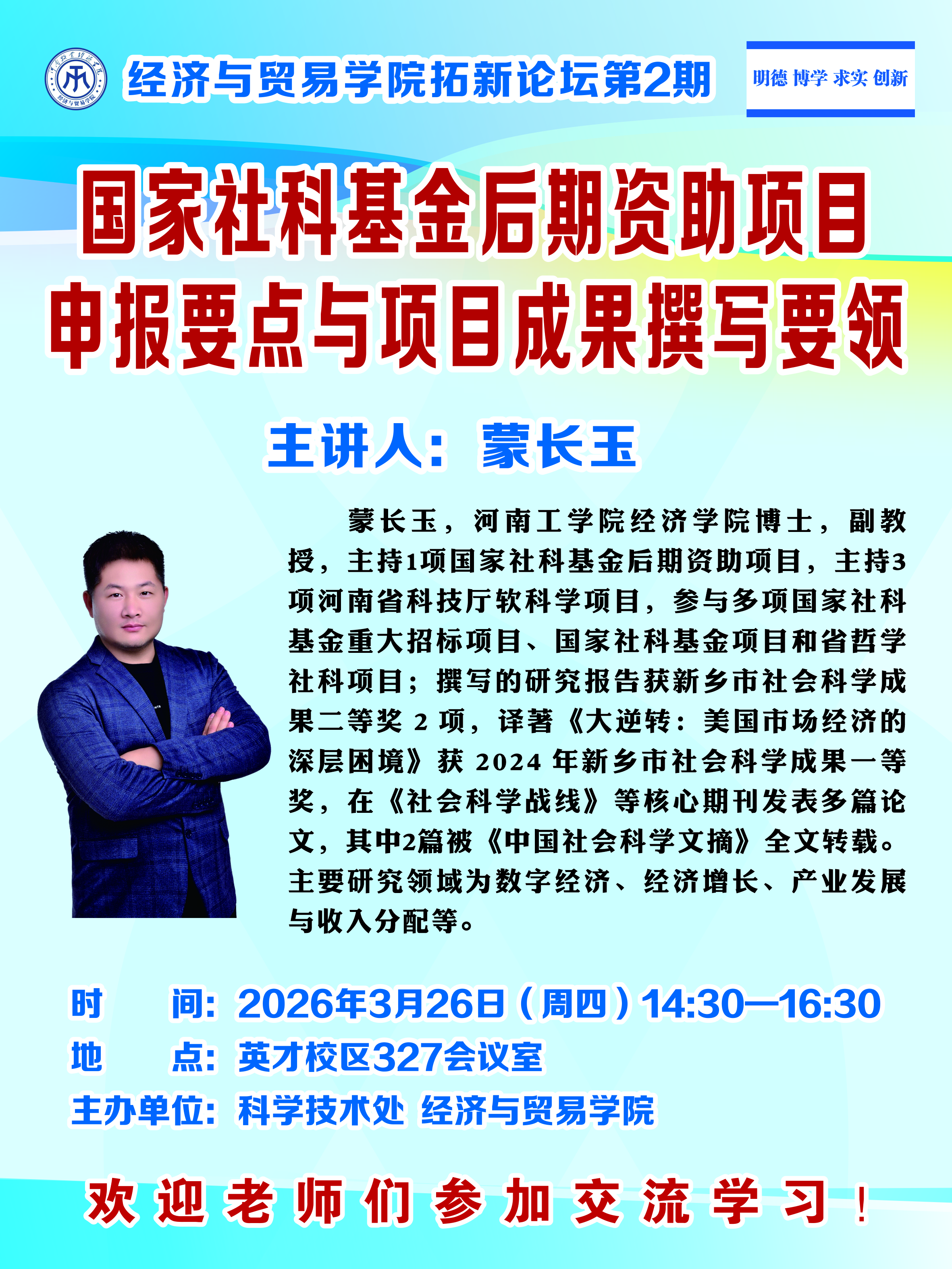学术活动海报:国家社科基金后期资助项目申报要点与项目成果撰写要领(经济与贸易学院)
